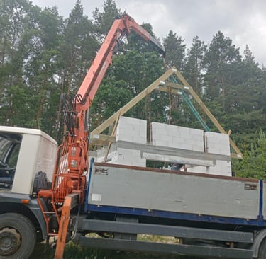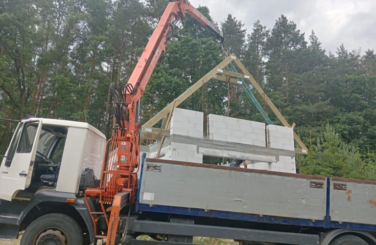 Dowozimy i delikatnie podnosimy więźby dachowe, belki bez ryzyka uszkodzeń.